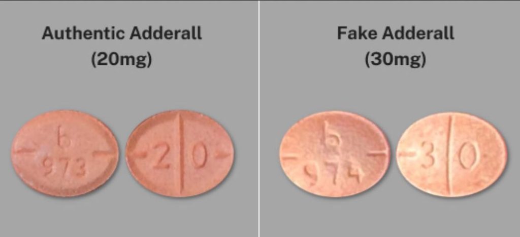 تصویر بالا سمت چپ، نمونهای از قرص آدرال اصلی (داروی ترکیبی دکستروآمفتامین-آمفتامین) را نشان میدهد. تصویر سمت راست نمونه همان قرص اما تقلبی و آغشته به فنتانیل است.