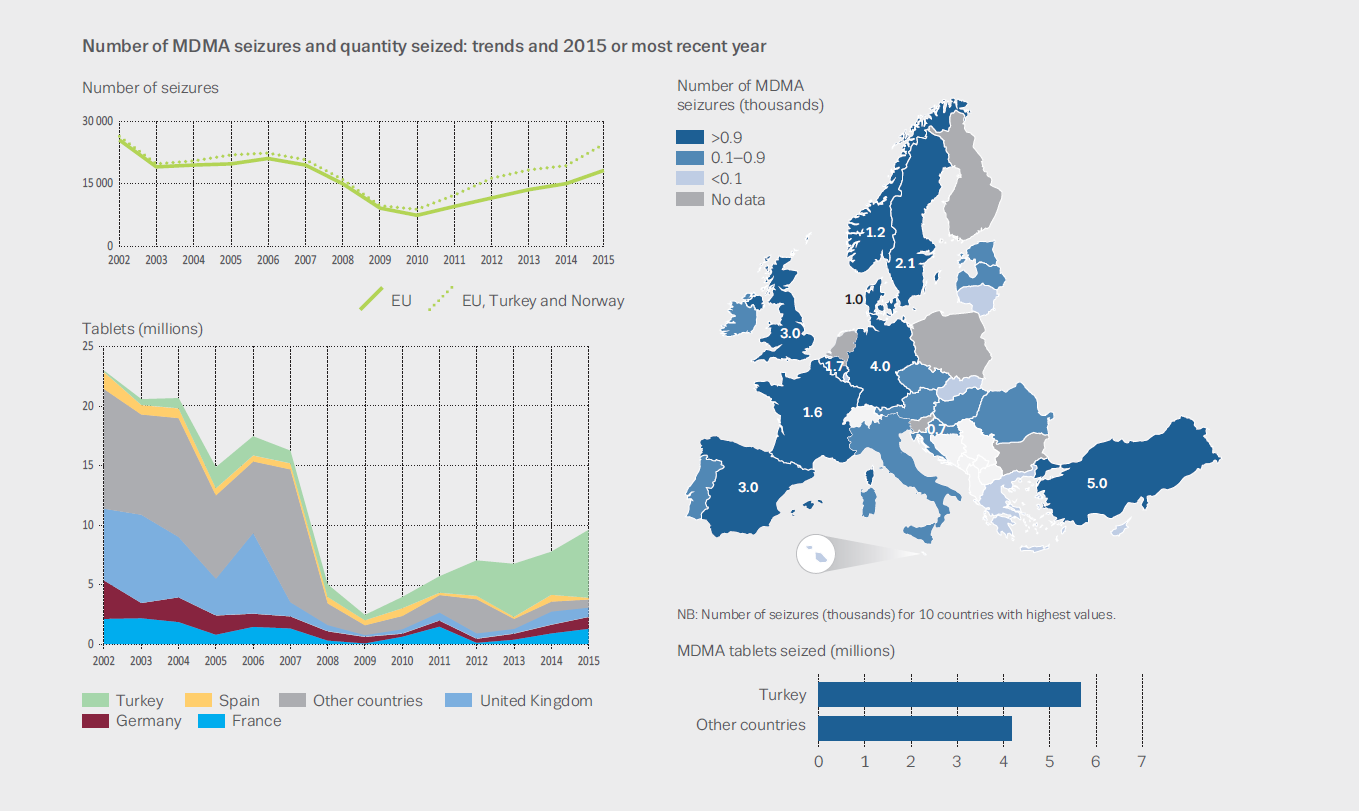 در جدول ذیل حجم و تعداد کشفیات مادهی محرک MDMA در سالهای اخیر به تفکیک کشورهای اروپایی ارائهشده است، که نشان از افزایش میزان کشفیات این ماده بهویژه از سال ۲۰۰۹ به بعد دارد.