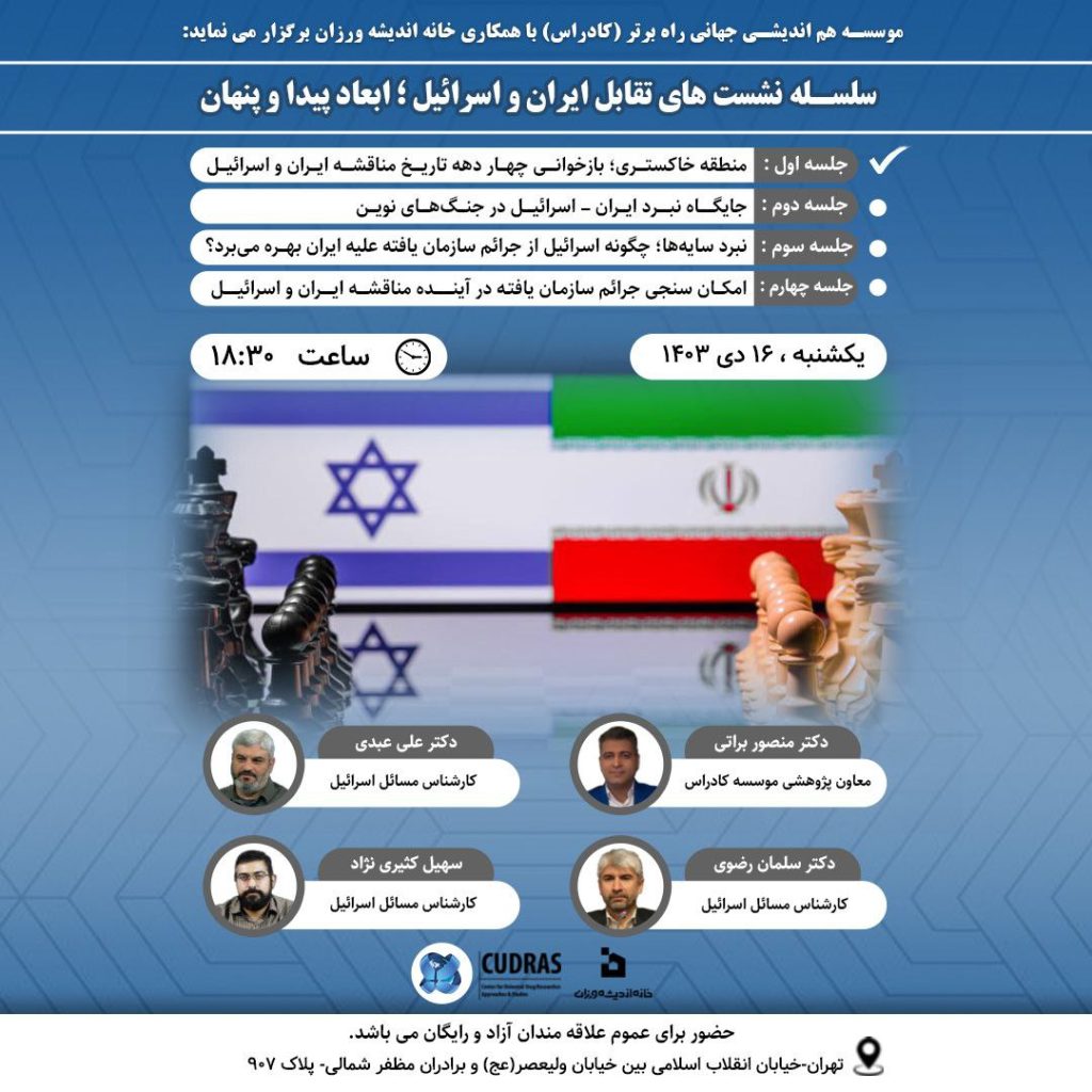بر این اساس، مؤسسه هماندیشی جهانی راه برتر (کادراس) در اولین نشست از سلسله نشستهای «تقابل ایران و اسرائیل؛ ابعاد پیدا و پنهان» با همکاری خانه اندیشهورزان به موضوع «منطقه خاکستری؛ بازخوانی چهار دهه تاریخ مناقشه ایران و اسرائیل» پرداخت.